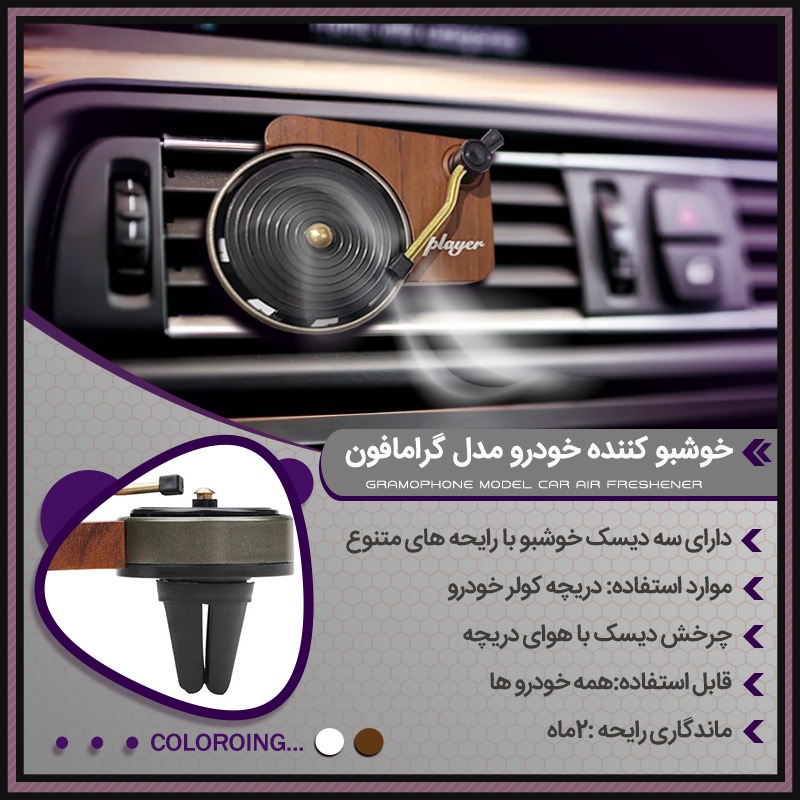 خوشبو کننده داخل خودرو یکی از وسیله های مورد نیاز داخل خودرو است که هم باعث تغییر بوی داخل خودرو میشود هم باعث زیبا تر شدن فضای داخلی خودرو میشود اگر این محصول تزیینی باشد . این محصول در دریچه کولر خودرو نصب میشود و طرح گرامافون دارد که حس نوستالژیکی به داخل خودرو میدهد . با ورود باد کولر یا بخاری به این محصول صفحه روی آن شروع به چرخش میکند همانند یک گرامافون قدیمی . داخل بسته بندی محصول قرص خوشبو کننده قرار دارد که روی صفحه مشکی وسط قرار میگیرد . بعد از اتمام پخش بوی آن میتوایند از هر عطر و ادکلنی که مورد پسند شما است روی آن اسپری کرده و مجدد استفاده کنید .