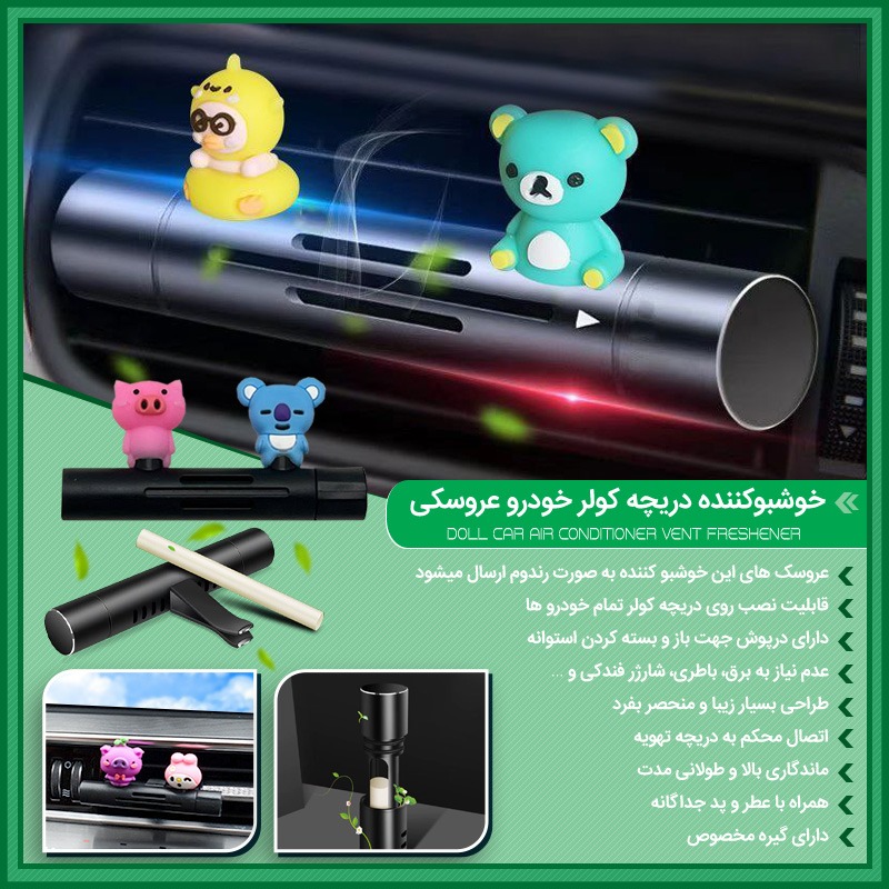 خوشبو کننده ای تولید شده که قابل نصب بر روی دریچه کولر بوده و علاوه بر زیبایی داخل خودرو هوای داخل خوردرو را خوشبو و تازه می نماید. این خوشبو کننده دارای بوی بسیار خاص و مطبوع بوده که حال خوب و فضای لذت بخشی داخل خودروایجاد میکند. این خوشبوکننده دریچه کولر خودرو عروسکی به شکل استوانه کوچک زیبا و براق است که به کمک گیره به دریچه کولر متصل می شود.